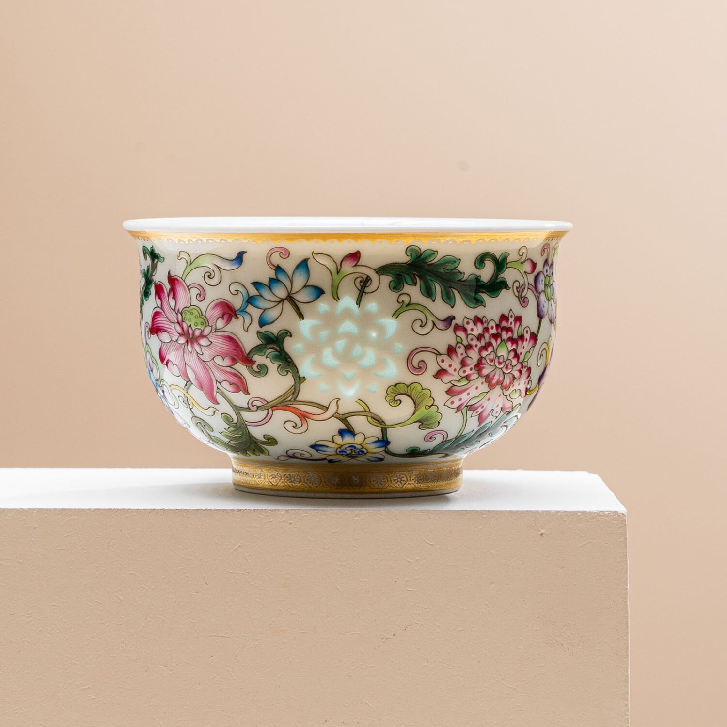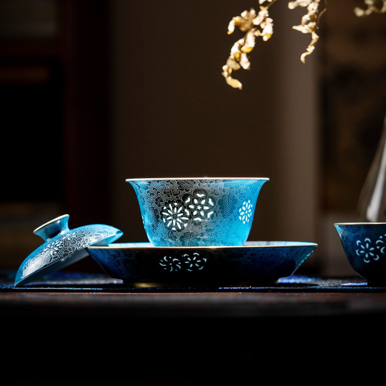 Design Highlights:Inspired by the phoenix tail grass, symbolizing endless life and freedom, the entire set is purely handcrafted by senior ceramic art masters. The foot ring and rim feature master-level hand-chiseled gold plating, with smooth and rounded edges, embodying the pursuit of a beautiful life. The cup body is coated with five-color glazes, with layered and vivid hues by the master to reflect the richness of life. The “Pijiu Hua” patterns are meticulously scraped and carved by artisans, symbolizing perfect harmony. The exquisitely linglong-carved petals, with light and shadow angles precisely calculated by the master, create a poetic dynamic visual effect as if flowers are swaying when light penetrates.